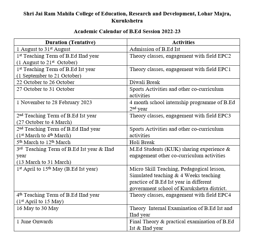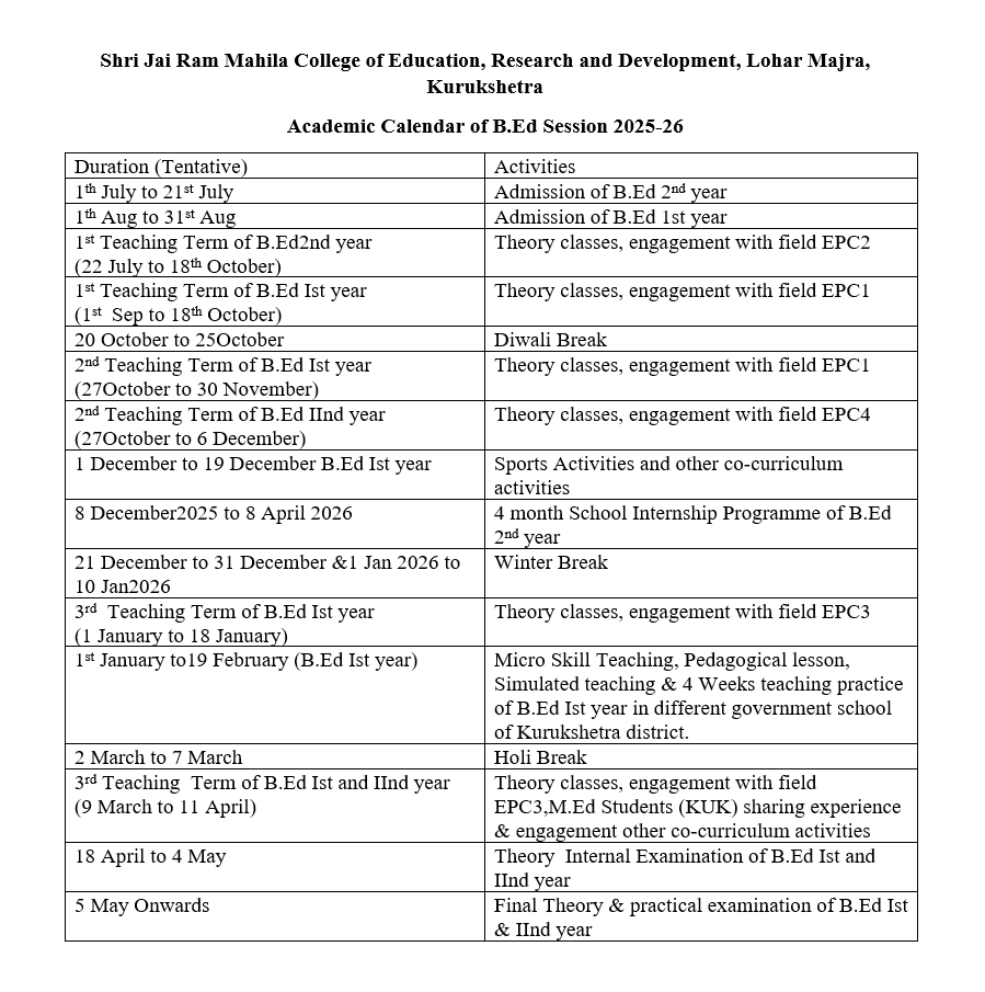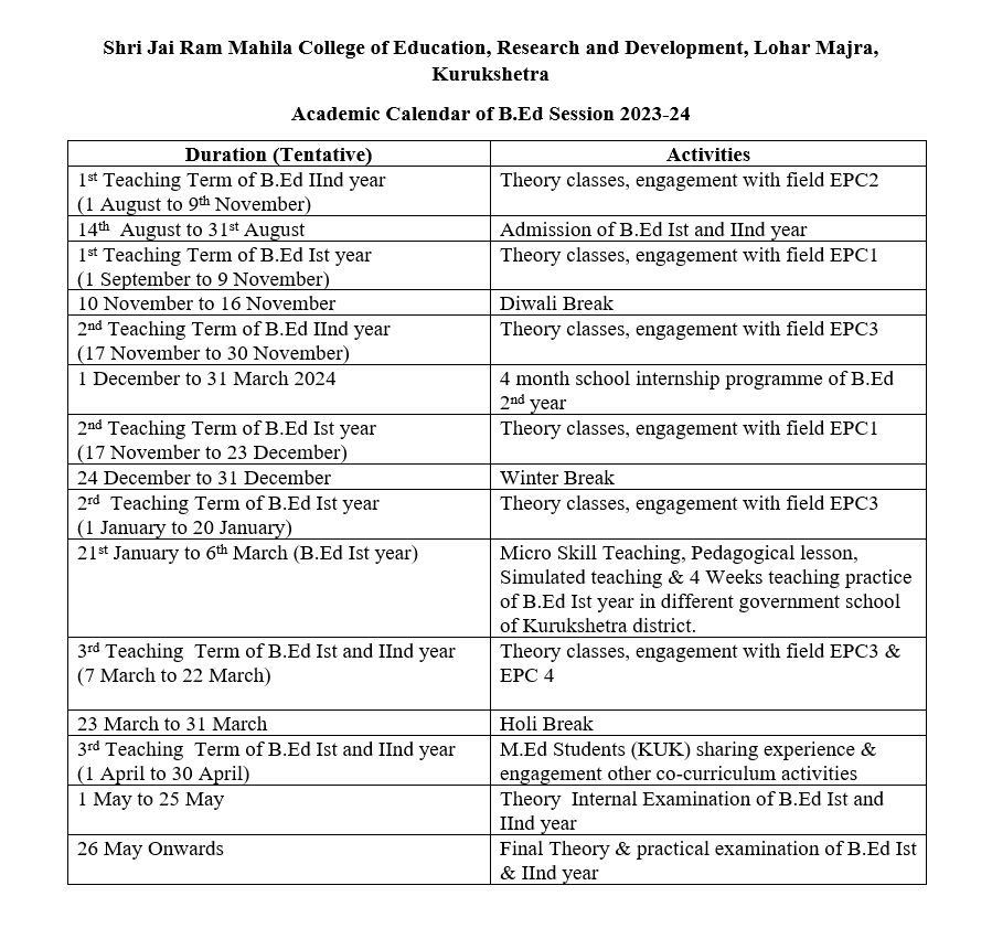 Download / View Academic Calender B.Ed